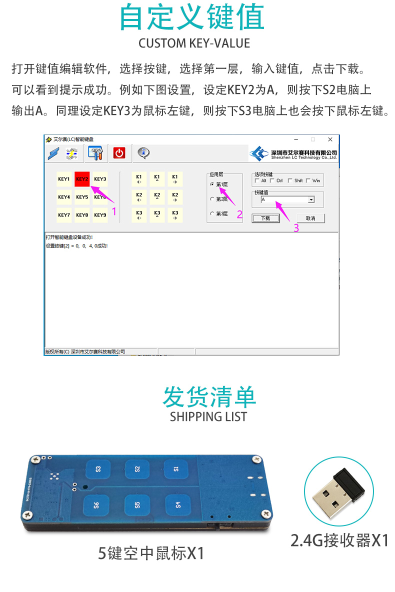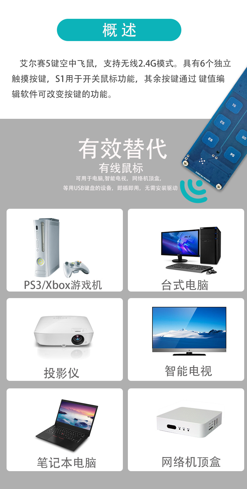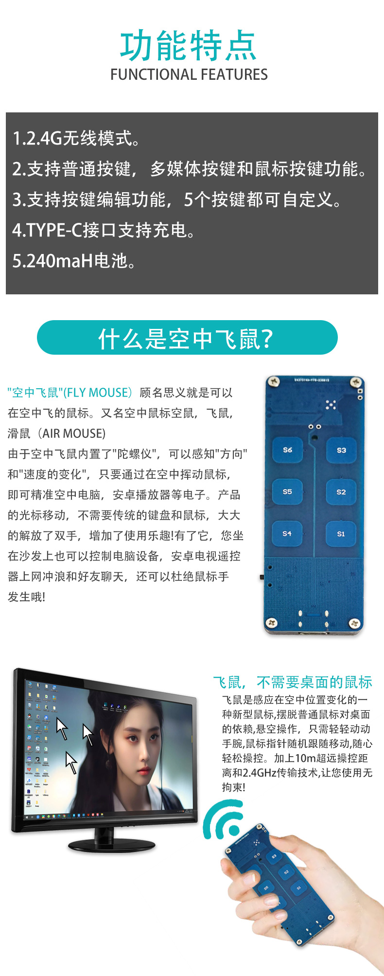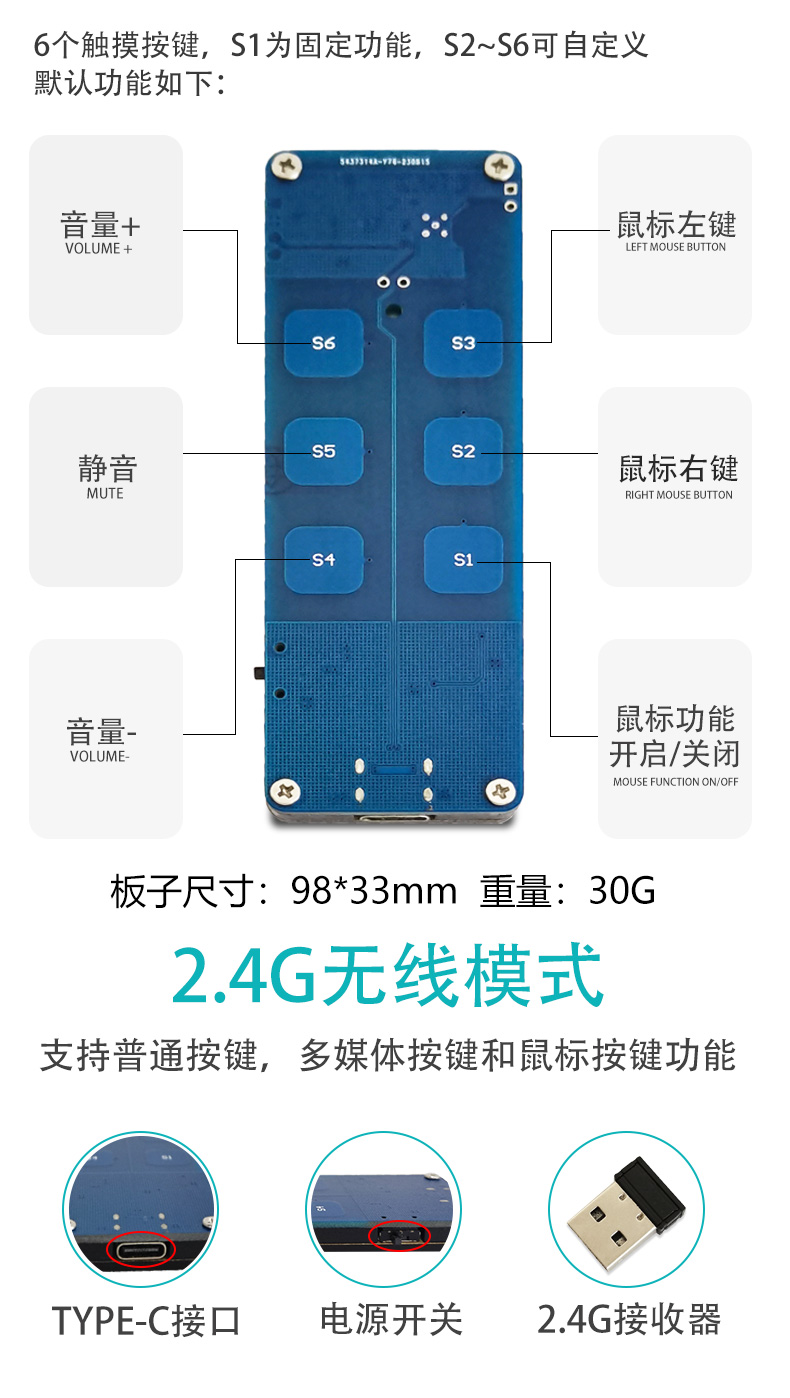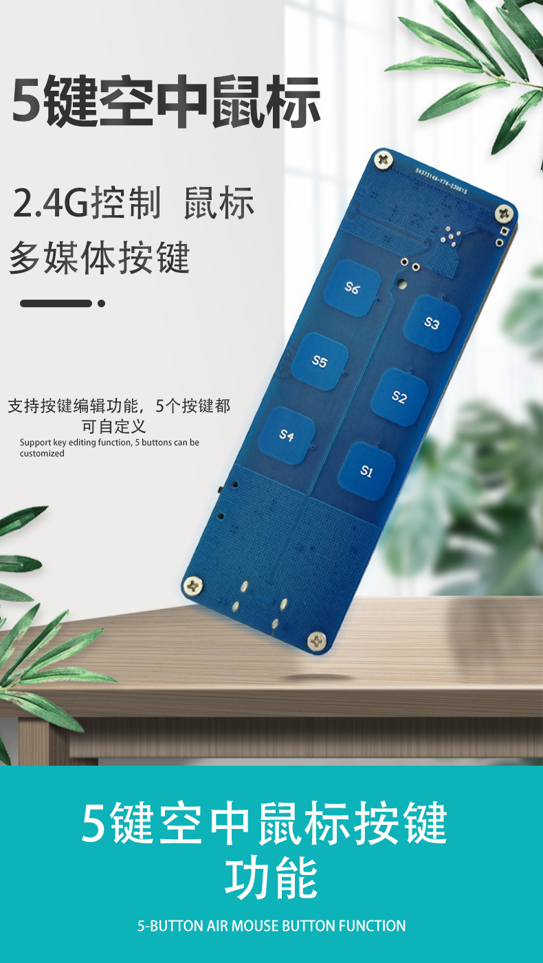 5键空中飞鼠 2.4G控制 自定义按键 鼠标多媒体按键功能模块