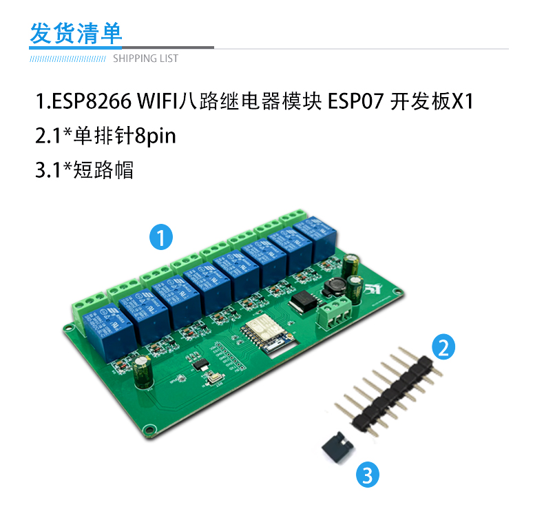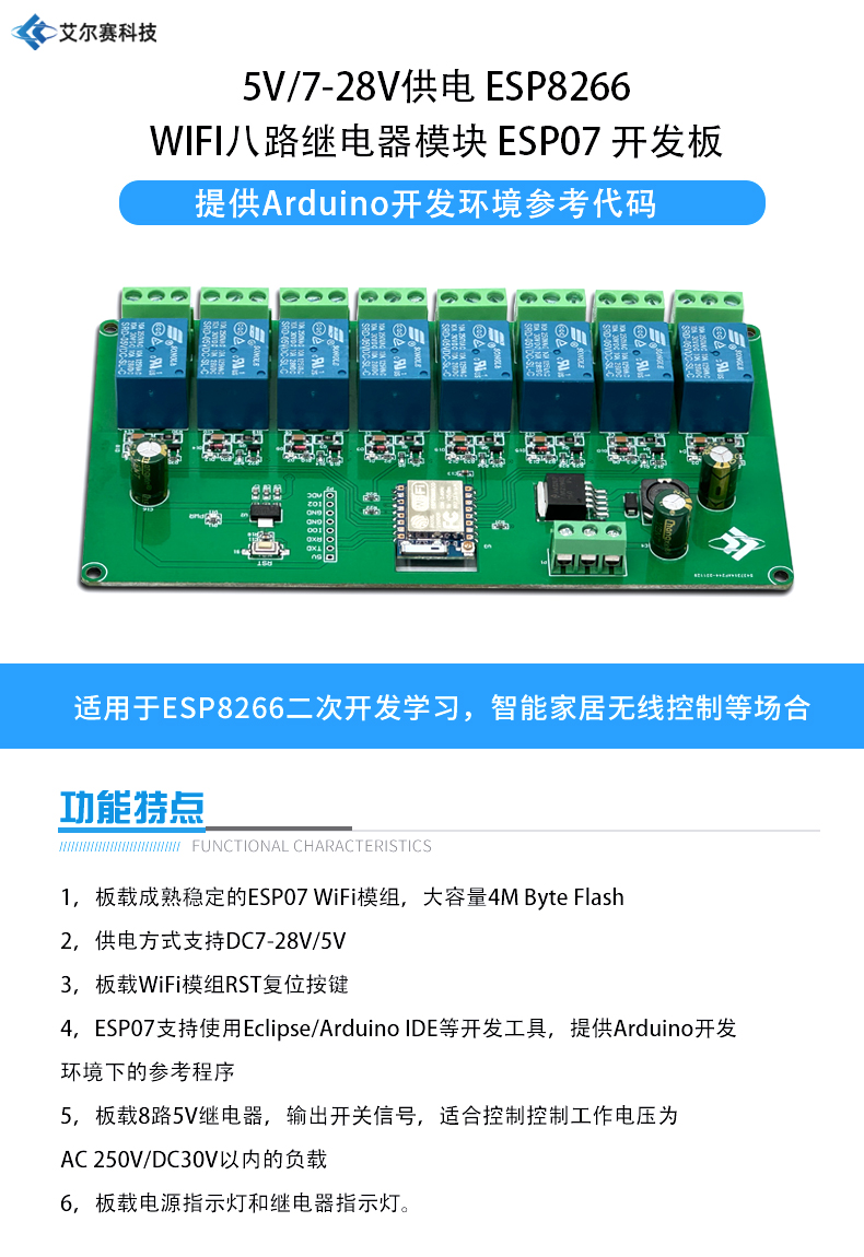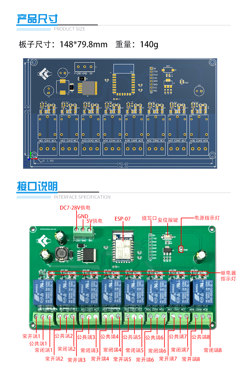 ESP-07 八路WIFI继电器模块5V/7-28V供电 ESP8266开发板 二次开发
