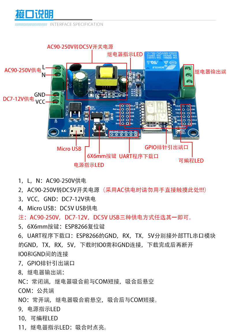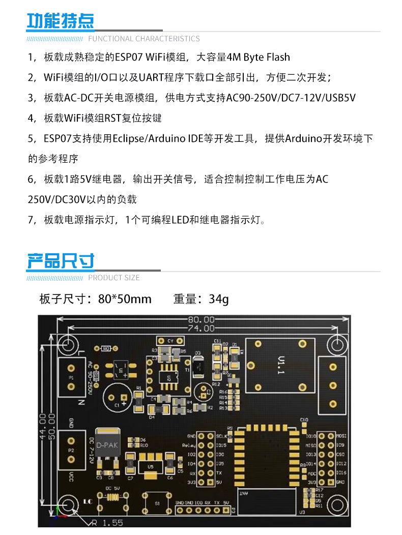 ESP-07 单路WIFI继电器模块 AC/DC供电 ESP8266开发板 二次开发