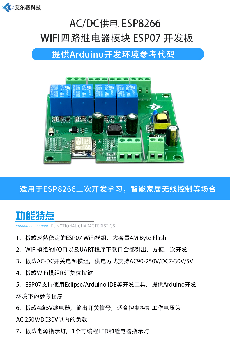 ESP-07 四路WIFI继电器模块 AC/DC供电 ESP8266开发板 二次开发