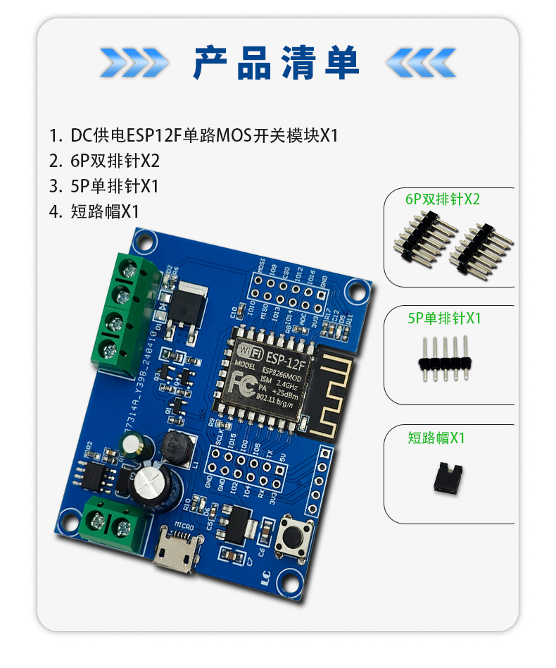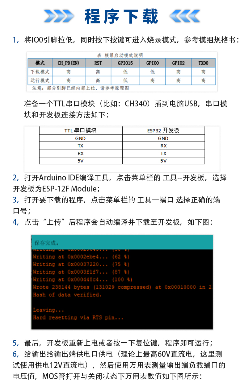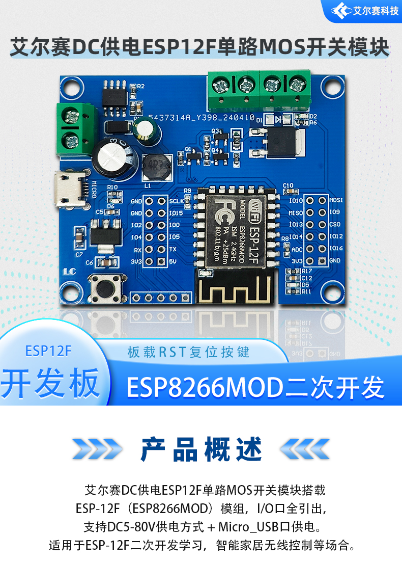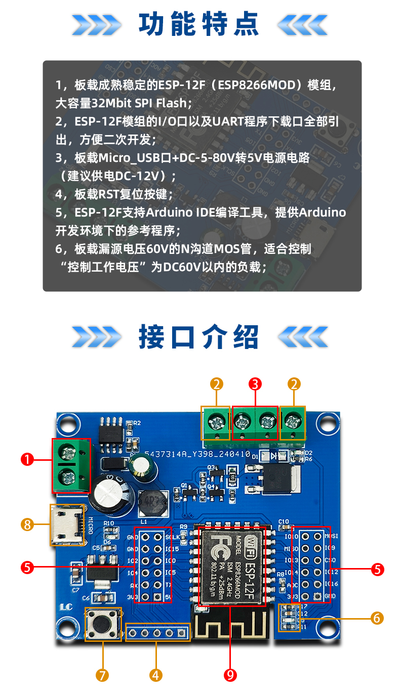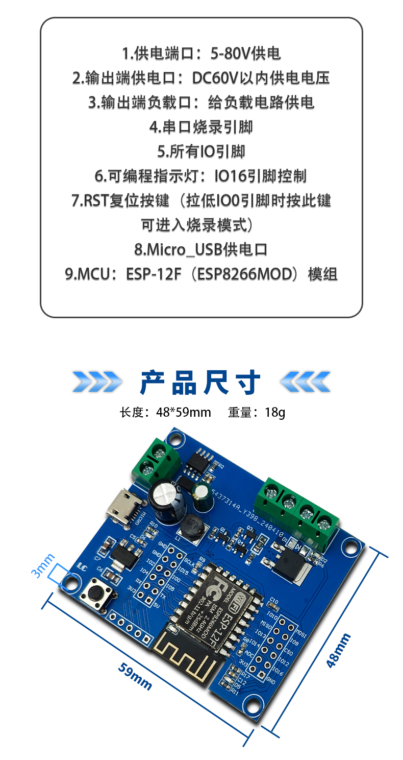 DC供电ESP12F单路MOS开关模块 5-80V输入 开发板