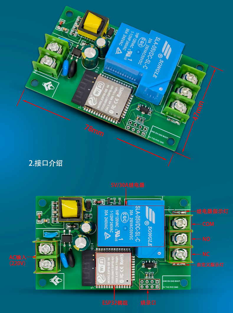 ESP32单路AC供电30A继电器模块 WiFi蓝牙二次开发板 不带电压输出