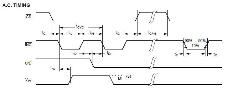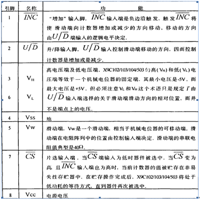 在各种电桥电路中,为了调节电桥平衡,必须对电位器进行多次调节,方能使电桥达到平衡,在使用过程中,当这些电位器受到振动,冲击,温度,湿度等外界环境因素的影响,电位器的位置和参数将发生变化,致使系统指标改变,要使系统达到原状,必须进行调节,这给使用带来很多的不便,为此,在电桥的桥臂电路中,使用数组电位器和数字技术,不仅克服上述缺点,还可以大大提高系统的精度。 X9C104是100阶数字电位器,具体有X9C102/103/104/503系列,电阻范围为40R~100K,X9C104内部包含有99个电阻阵列,在每个单元之间和两个端点上都有被滑动单元访问的抽头点,滑动单元的位置由CS,U/D和INC三个输入端控制,一但位置选定后,可存放在非易失性存储器中,在下次上电之后可重新调用。数字电位器的变化均是阶梯式或者增量式,阻值变化成线性变化。 例如X9C104,阻值范围40R~100K,共分为100阶,则每个抽头点的增量为1010R。 有温度补偿功能:端点间的电阻误差:±20%; 滑动端位置数据可长时间保存,时间为100年; 电阻分辨率较高:1%。