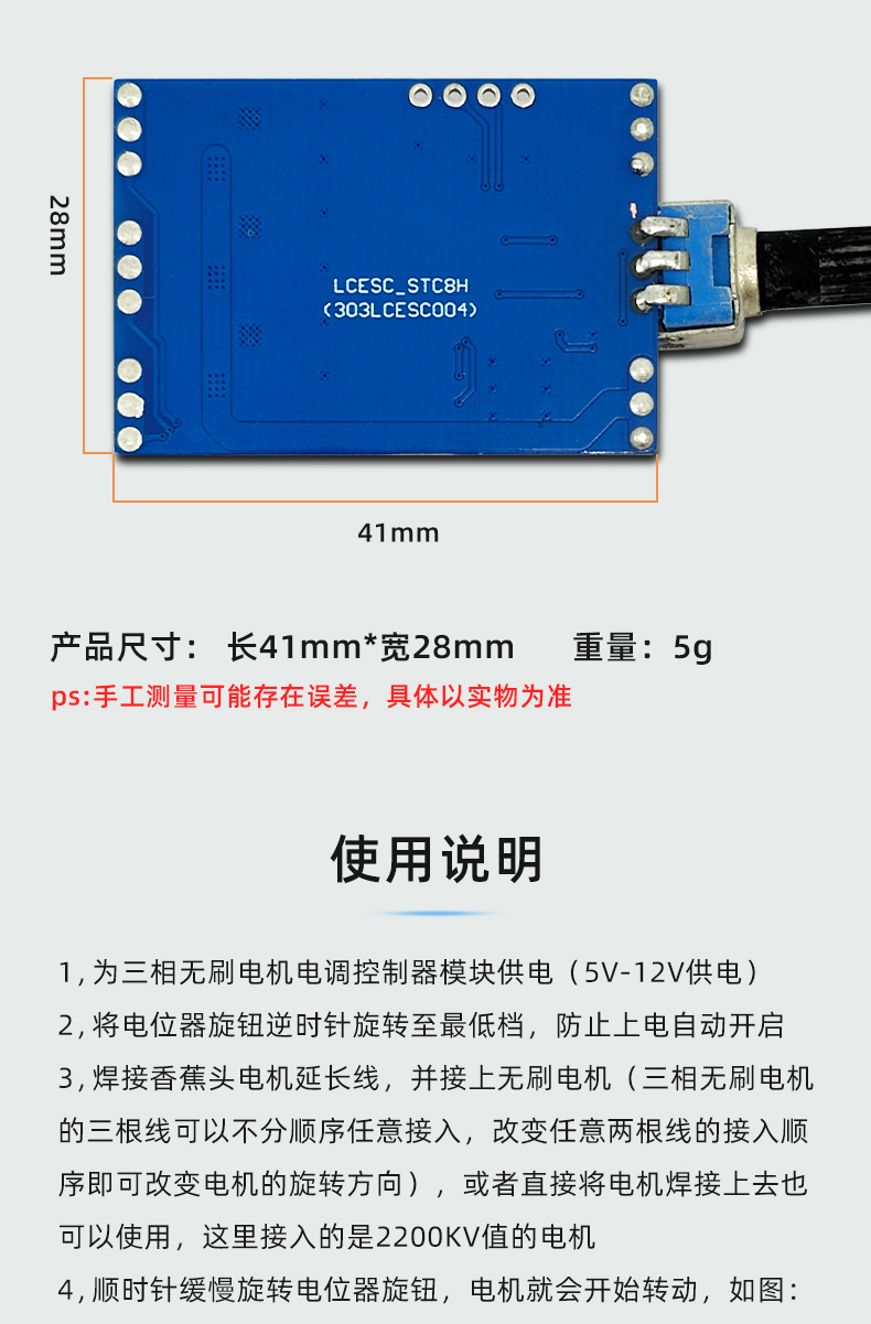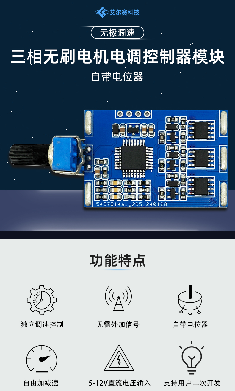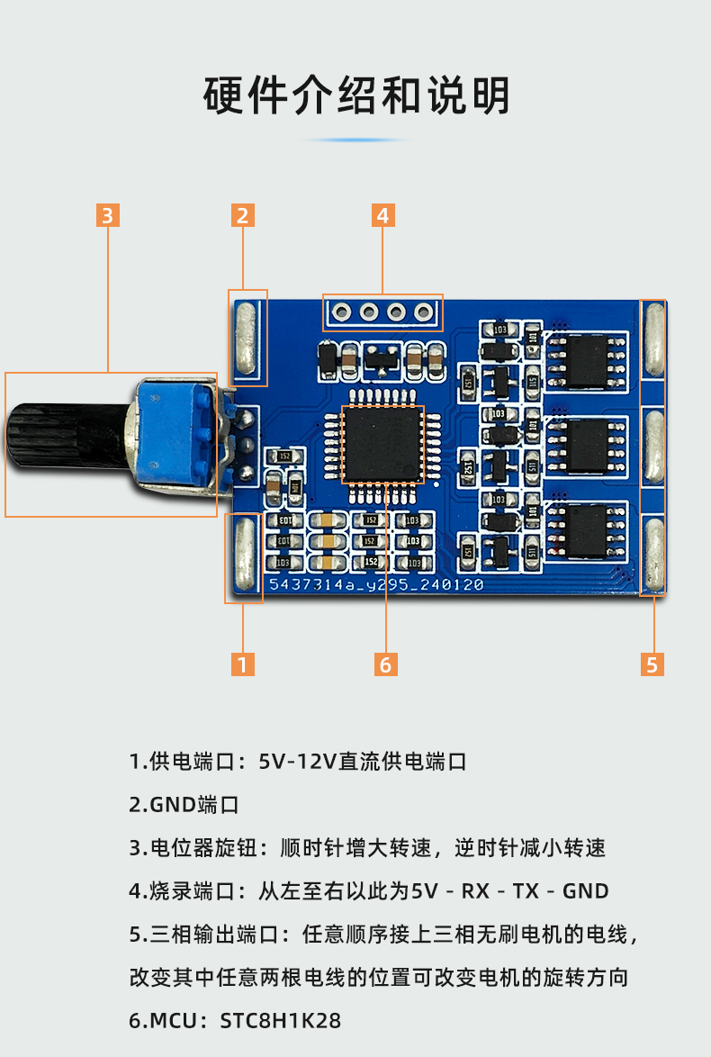 直流三相无刷电机电调控制器模块 STC8H 自带电位器 无极调速