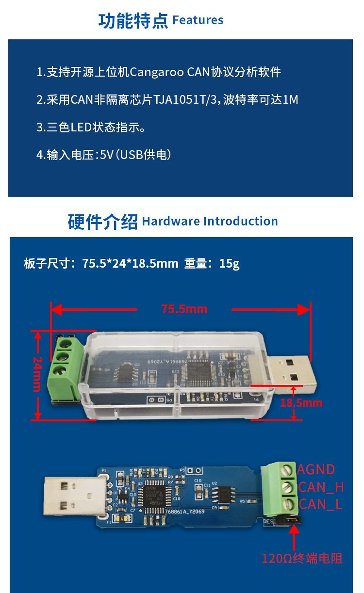 USB转CAN模块( TJA1051T/3 非隔离版本) CAN总线调试助手 CAN总线