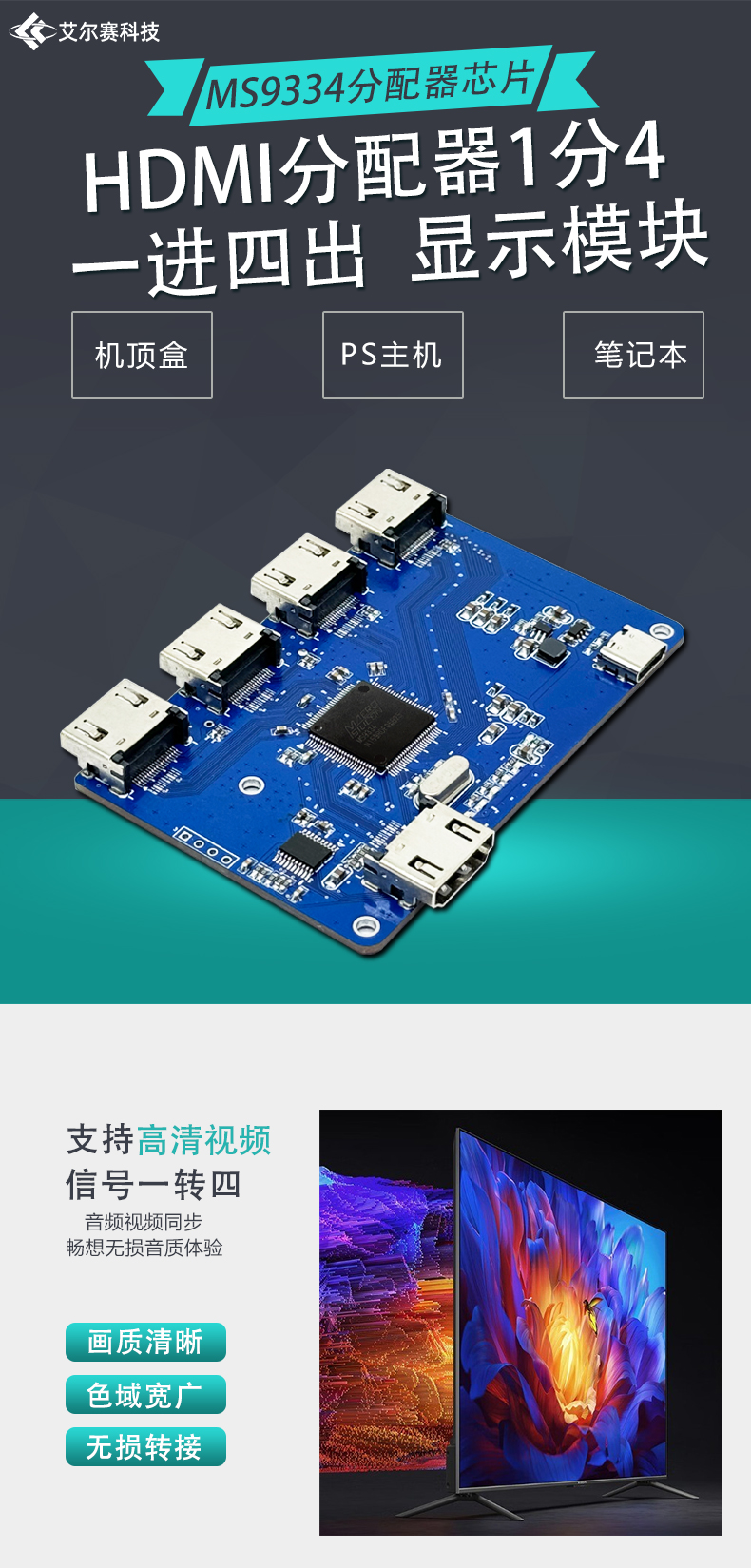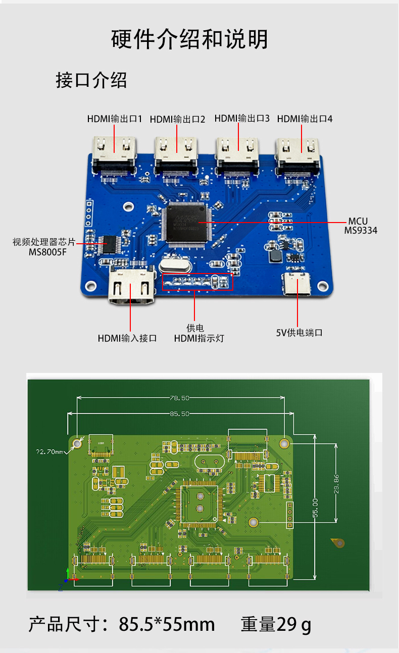 HDMI分配器1分4一进四出显示模块