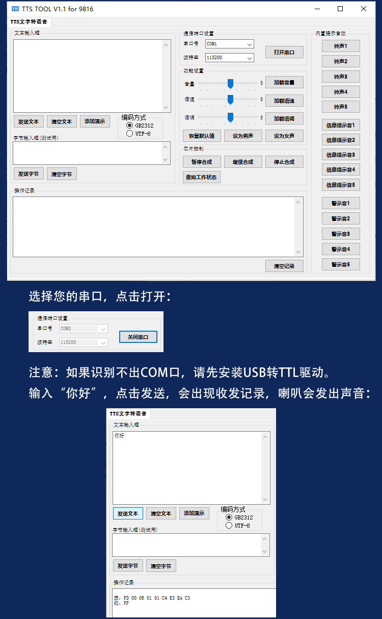 SNR9816VR TTS中文语音合成模块 真人发音实时文字转语音模块