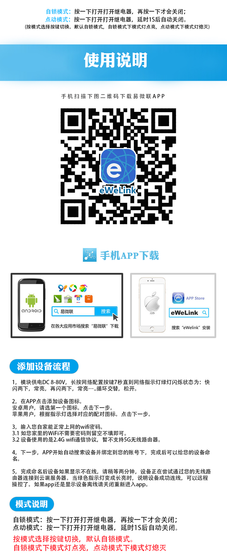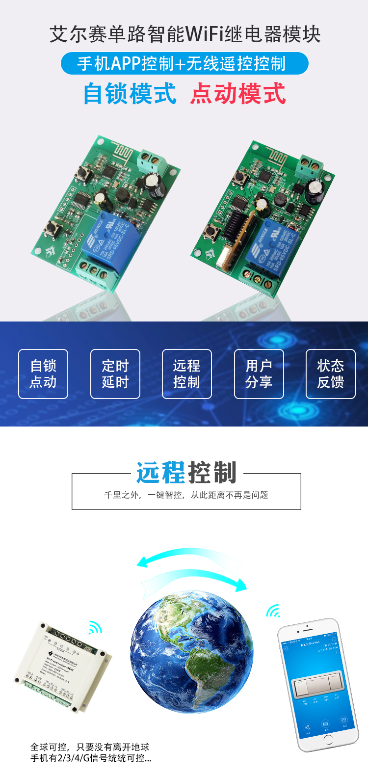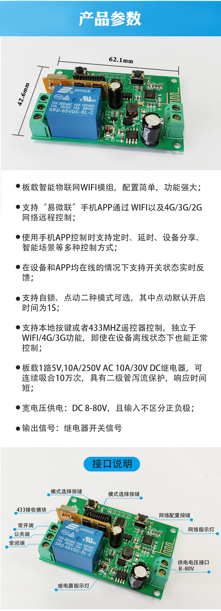 wifi远程继电器模块 手机app远程控制+433M无线遥控开关8-80v